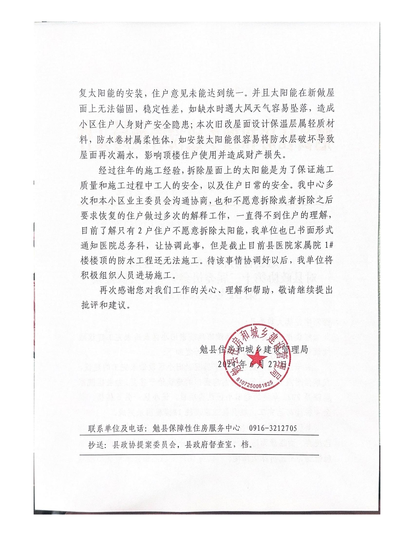 勉县医院家属院老旧小区改造施工已经2年余,大部分工程已经完成,但因1号家属楼楼顶太阳能拆除问题,被小区个别业主阻拦,使得1号家属楼楼顶至今未能处理,加之改造施工时对楼面的严重损坏,导致楼顶下雨渗水问题相当严重,顶楼及楼下住户苦不堪言,现在渗水已经到了4楼,多次与住建局和施工方协商,均以小区个别业主阻拦无法施工为借口不予解决这一民生关注的问题,业主意见很大。