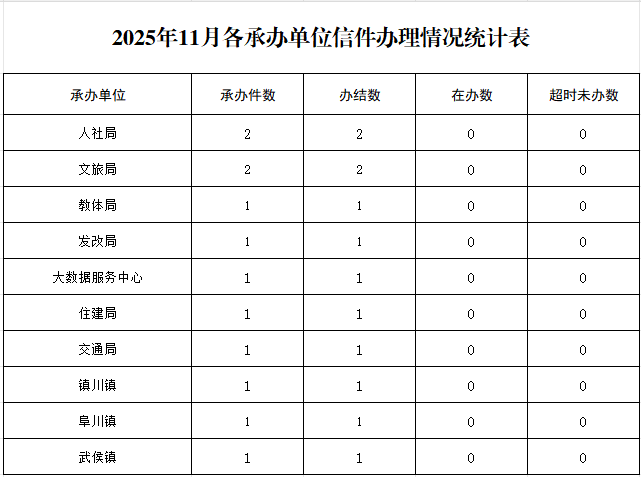 2025年11月各承办单位信件办理情况统计表