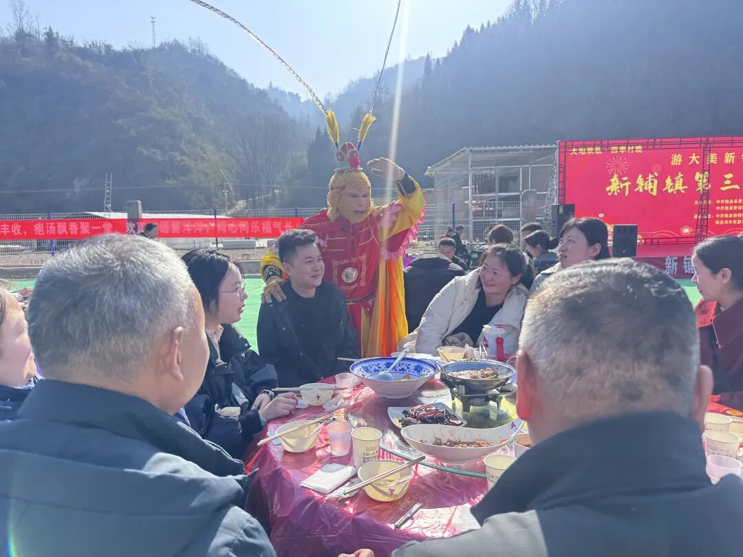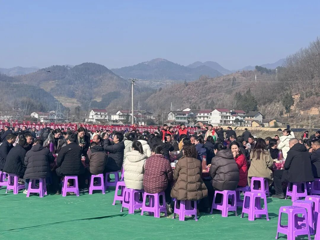 本届庖汤宴内容丰富、形式多样,充分展现了新铺镇独具特色的乡村文化和民俗风情。活动在热闹喜庆的文化节目表演中拉开序幕,舞蹈、歌唱等节目轮番上演,大家在欢声笑语中围坐一堂,品尝青椒爆肥肠、腊猪蹄炖莲藕、农村豆豉蒸肉、红豆腐乳蒸肉等特色庖汤美食,感受浓浓的乡情年味。200余名党员干部及新时代文明实践志愿者积极参与服务工作。活动现场还同步设置了“乡村集市农特产品展销区”,集中展示和销售本地特色农产品,既拓宽了群众增收渠道,也让游客把“新铺味道”带回家。