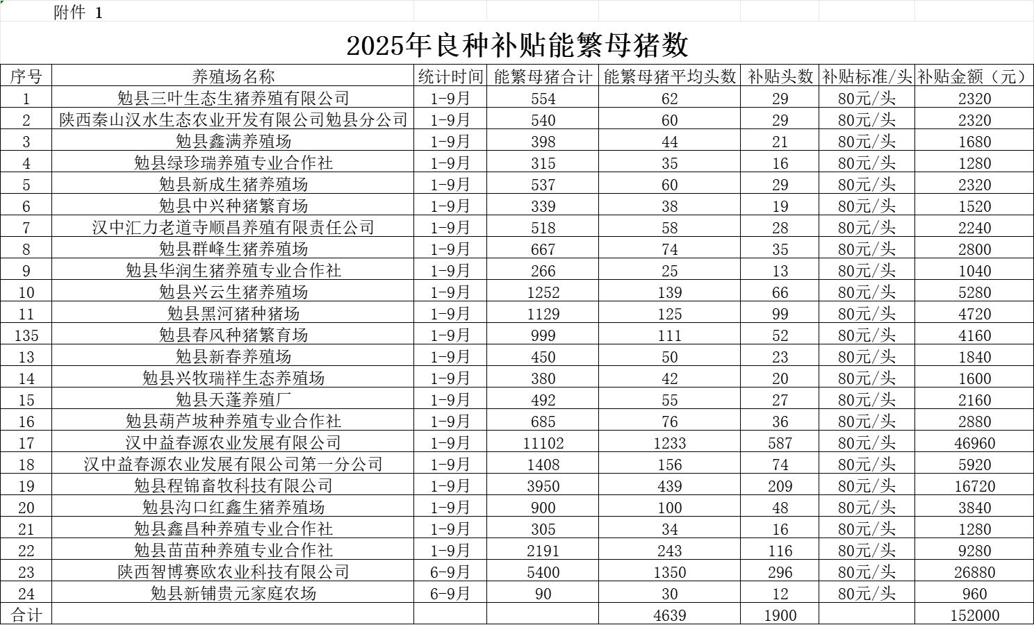 根据《汉中市农业农村局关于印发2025年农业产业发展资金实施方案的通知》(汉农计财【2025】29号),与勉农业发〔2025〕246号《关于下达2025年生猪良种补贴项目资金计划的通知》文件精神,为进一步推广生猪人工授精技术,不断扩大生猪良种覆盖范围,提高生猪生产水平。对全县纳入直连直报系统内饲养能繁母猪的养殖场进行能繁母猪人工授精精液补助1900头,共计补贴资金15.2万元。