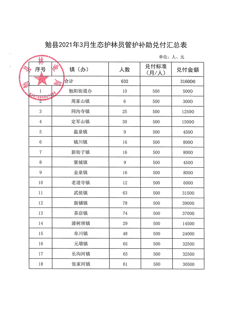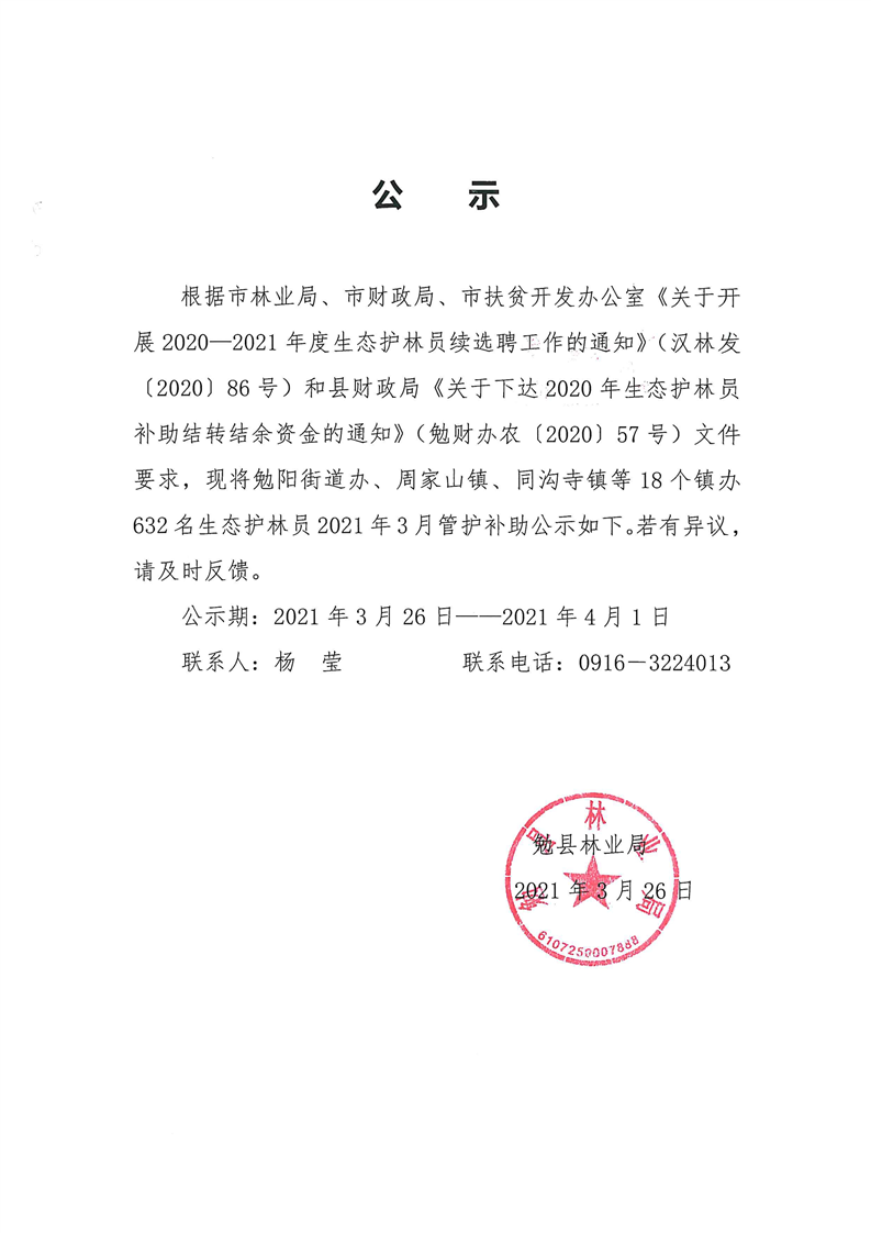 2021年3月生态护林员管护补助发放公示