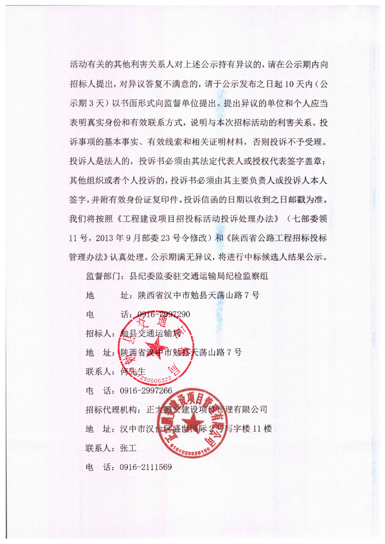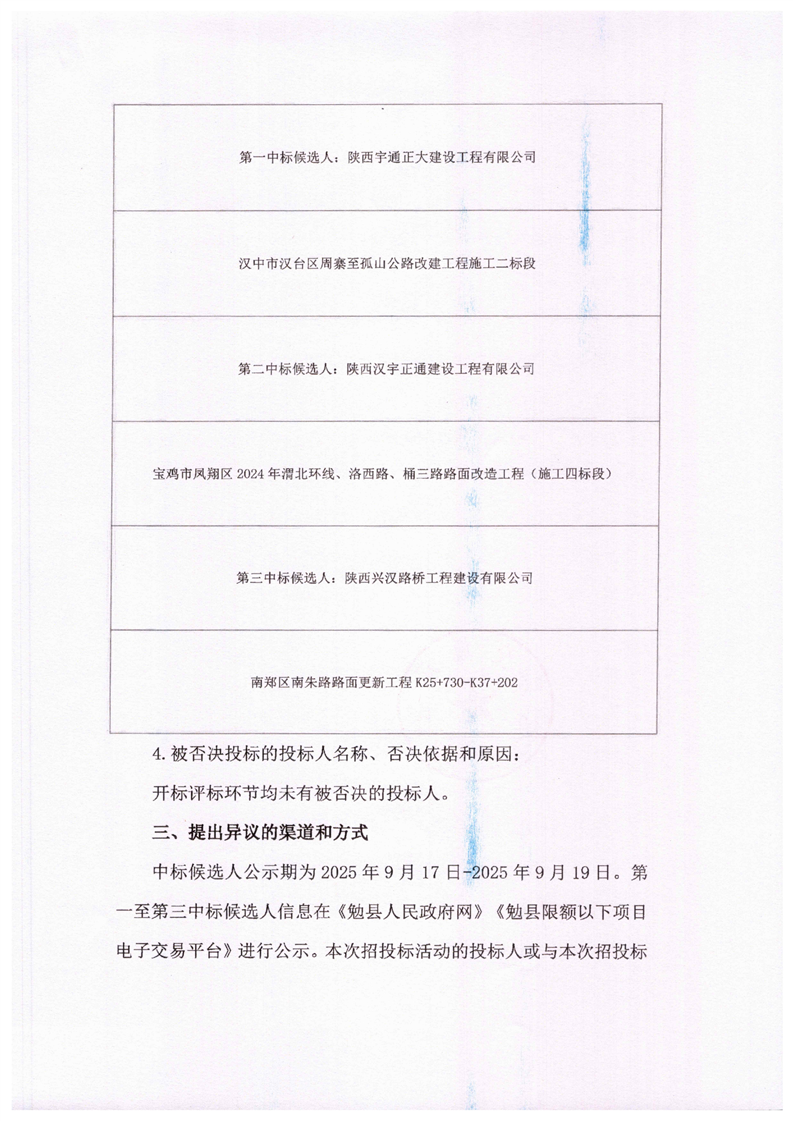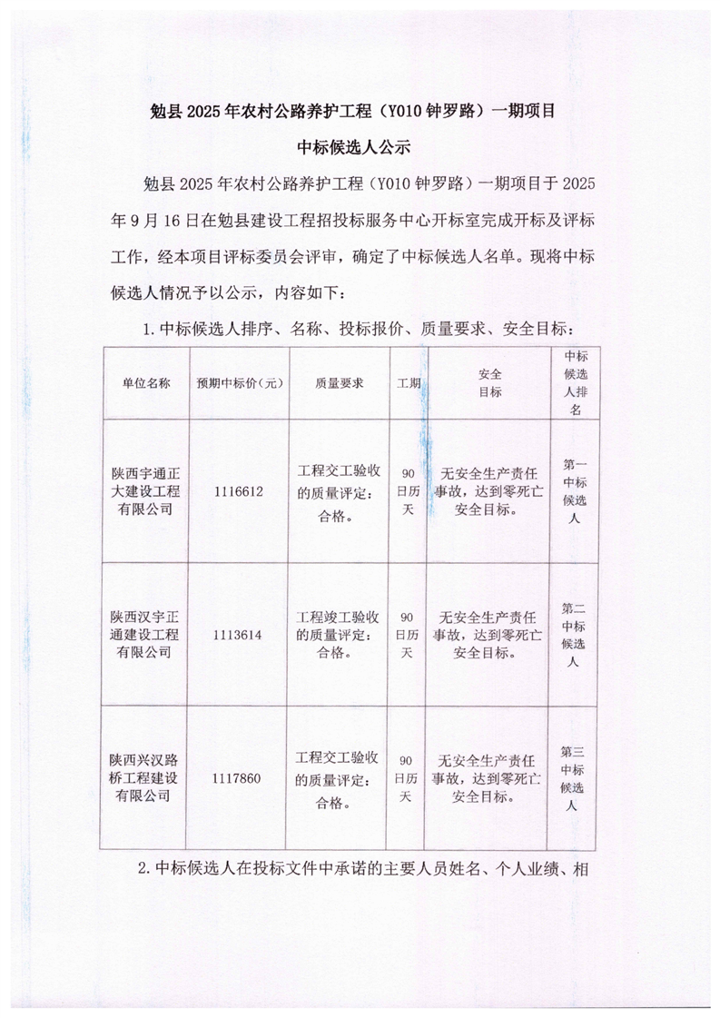 勉县2025年农村公路养护工程(Y010钟罗路)一期项目中标候选人公示