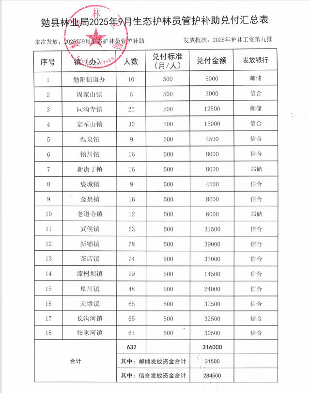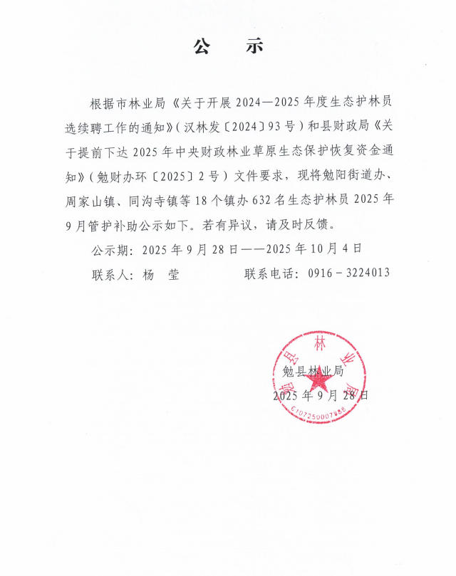 勉县林业局2025年9月生态护林员管护补助兑付公示