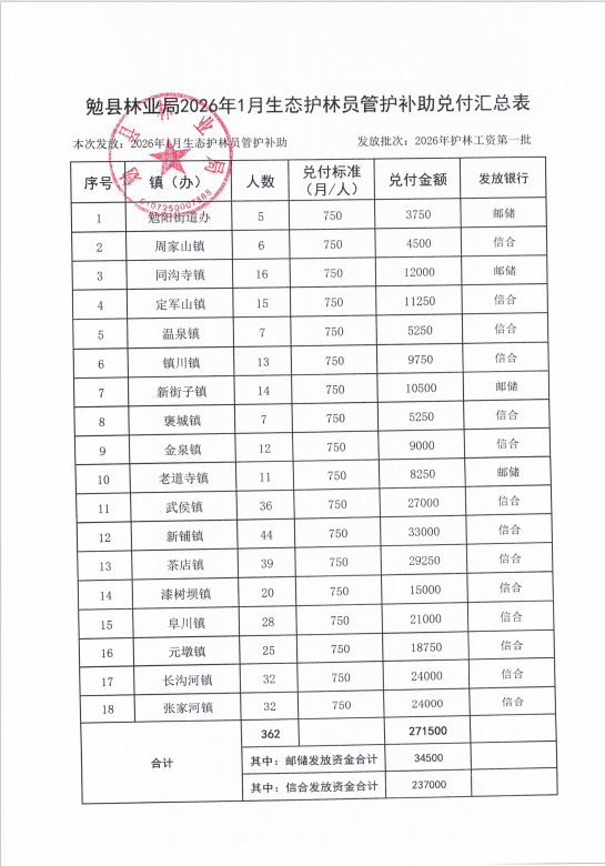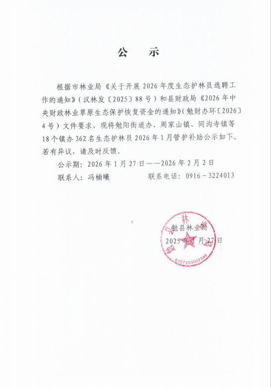 勉县林业局2026年1月生态护林员管护补助兑付公示