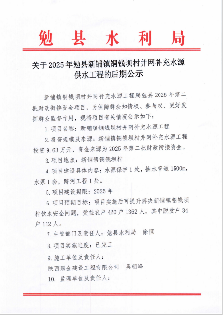2025年勉县新铺镇铜钱坝村并网补充水源供水工程的后期公示