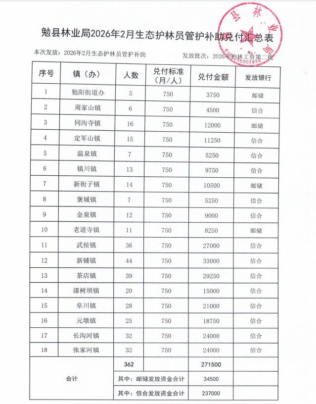 勉县林业局2026年2月生态护林员管护补助兑付公示