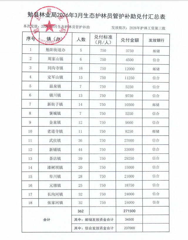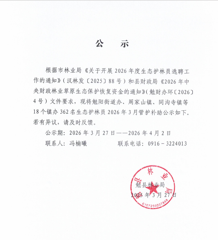 勉县林业局2026年3月生态护林员管护补助兑付公示