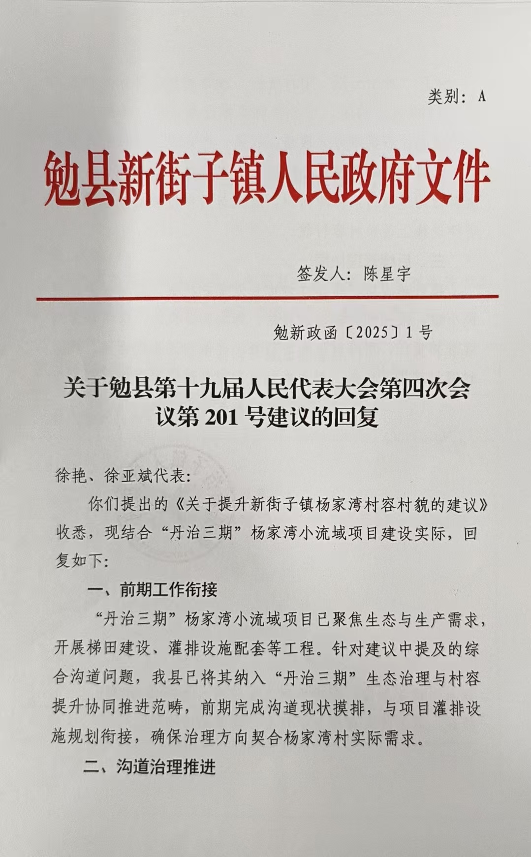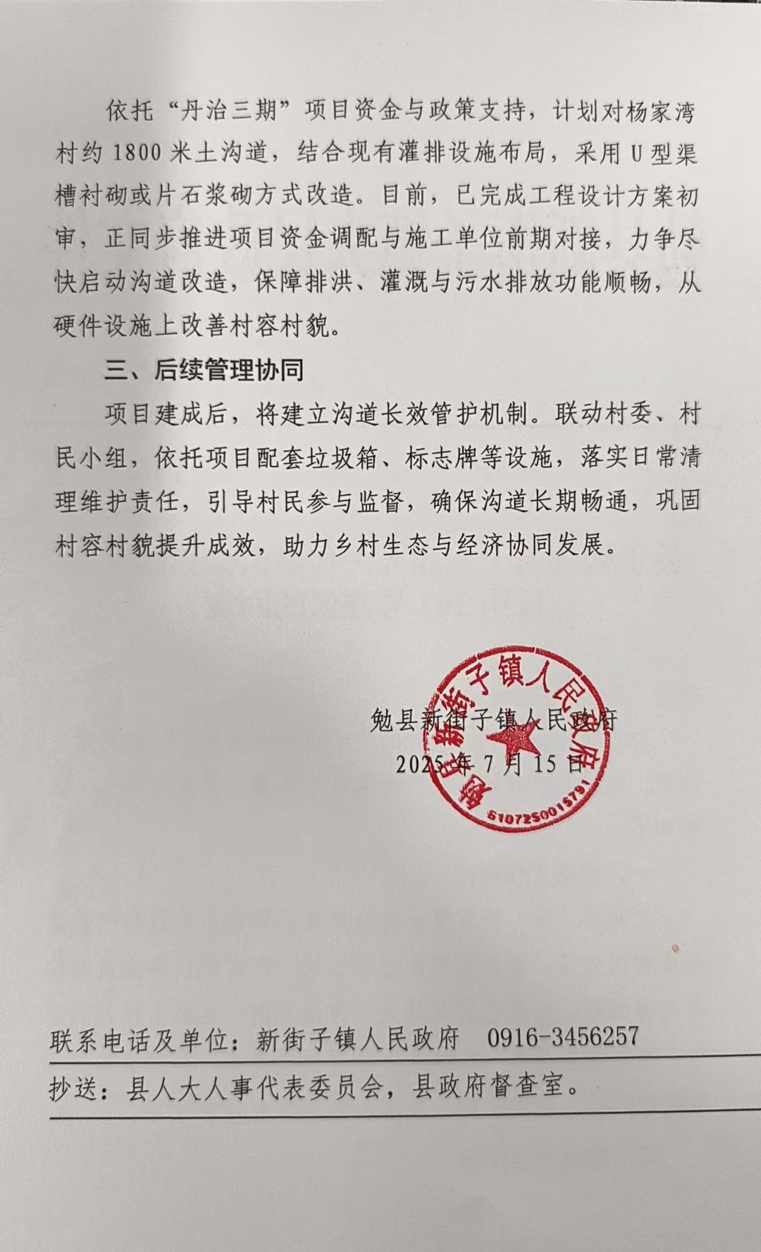 “丹治三期”杨家湾小流域项目已聚焦生态与生产需求,开展梯田建设、灌排设施配套等工程。针对建议中提及的综合沟道问题,我县已将其纳入“丹治三期”生态治理与村容提升协同推进范畴,前期完成沟道现状摸排,与项目灌排设施规划衔接,确保治理方向契合杨家湾村实际需求。