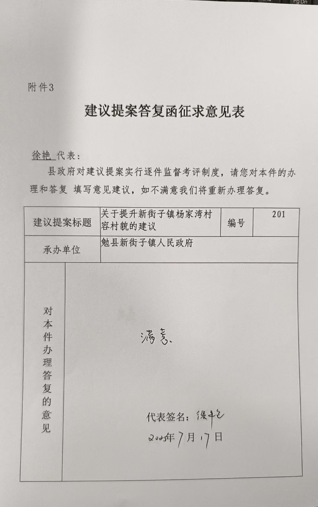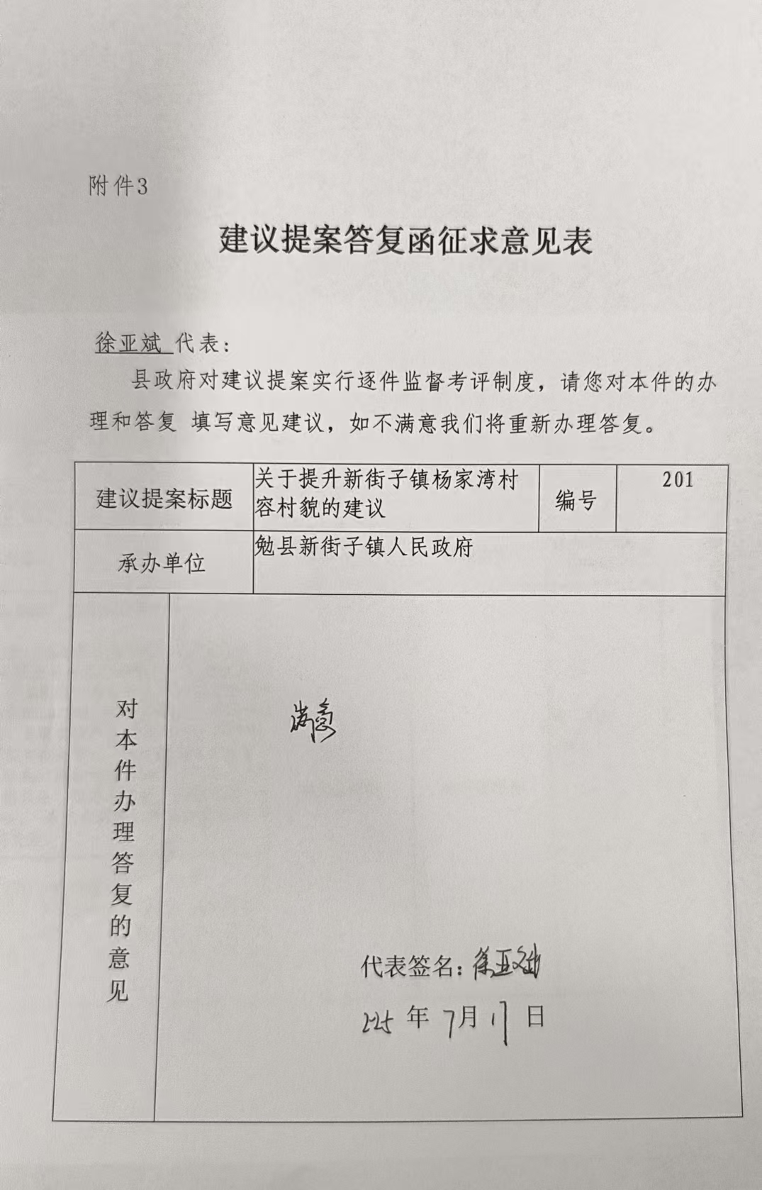 你们提出的《关于提升新街子镇杨家湾村容村貌的建议》收悉,现结合“丹治三期”杨家湾小流域项目建设实际,回复如下: