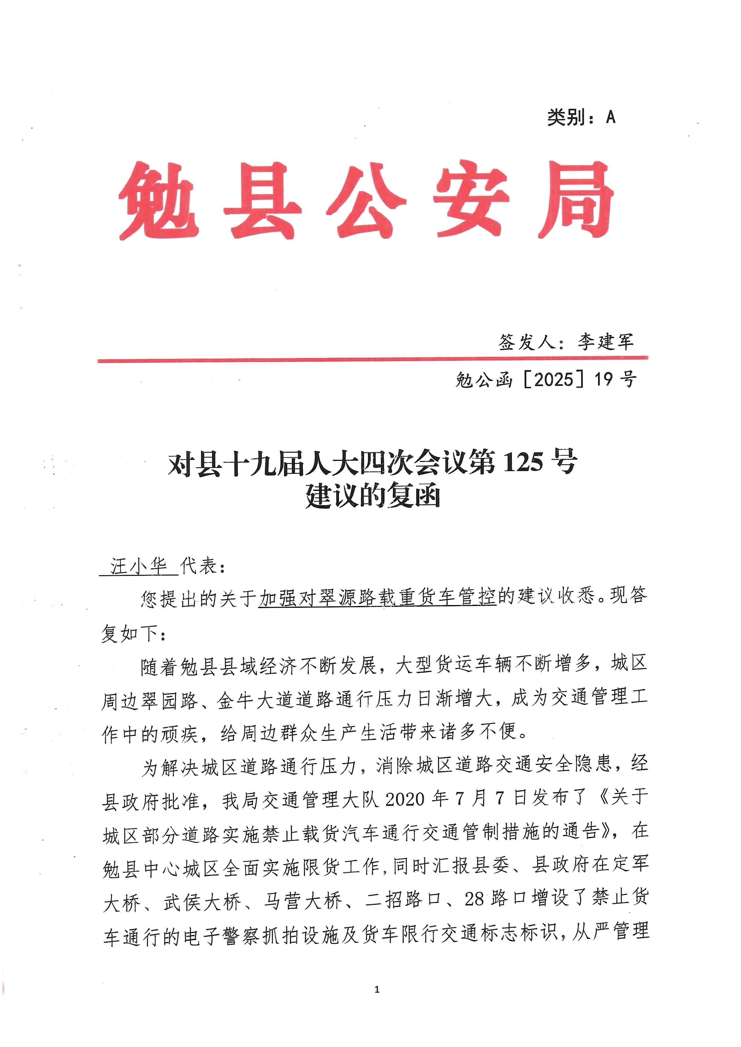 您提出的关于加强对翠源路载重货车管控的建议收悉。现答复如下: