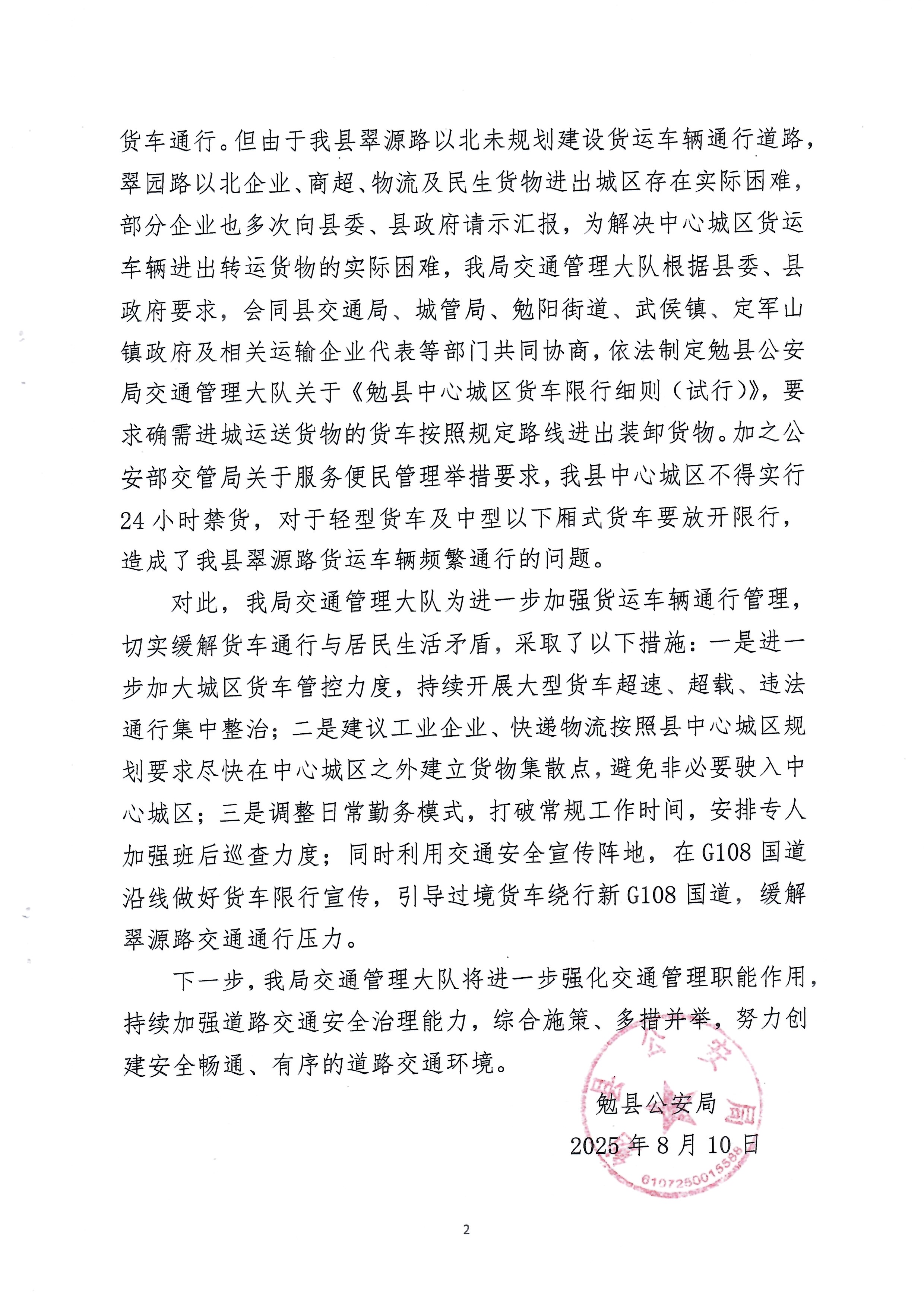 对此,我局交通管理大队为进一步加强货运车辆通行管理,切实缓解货车通行与居民生活矛盾,采取了以下措施:一是进一步加大城区货车管控力度,持续开展大型货车超速、超载、违法通行集中整治;二是建议工业企业、快递物流按照县中心城区规划要求尽快在中心城区之外建立货物集散点,避免非必要驶入中心城区;三是调整日常勤务模式,打破常规工作时间,安排专人加强班后巡查力度;同时利用交通安全宣传阵地,在G108国道沿线做好货车限行宣传,引导过境货车绕行新G108国道,缓解翠源路交通通行压力。