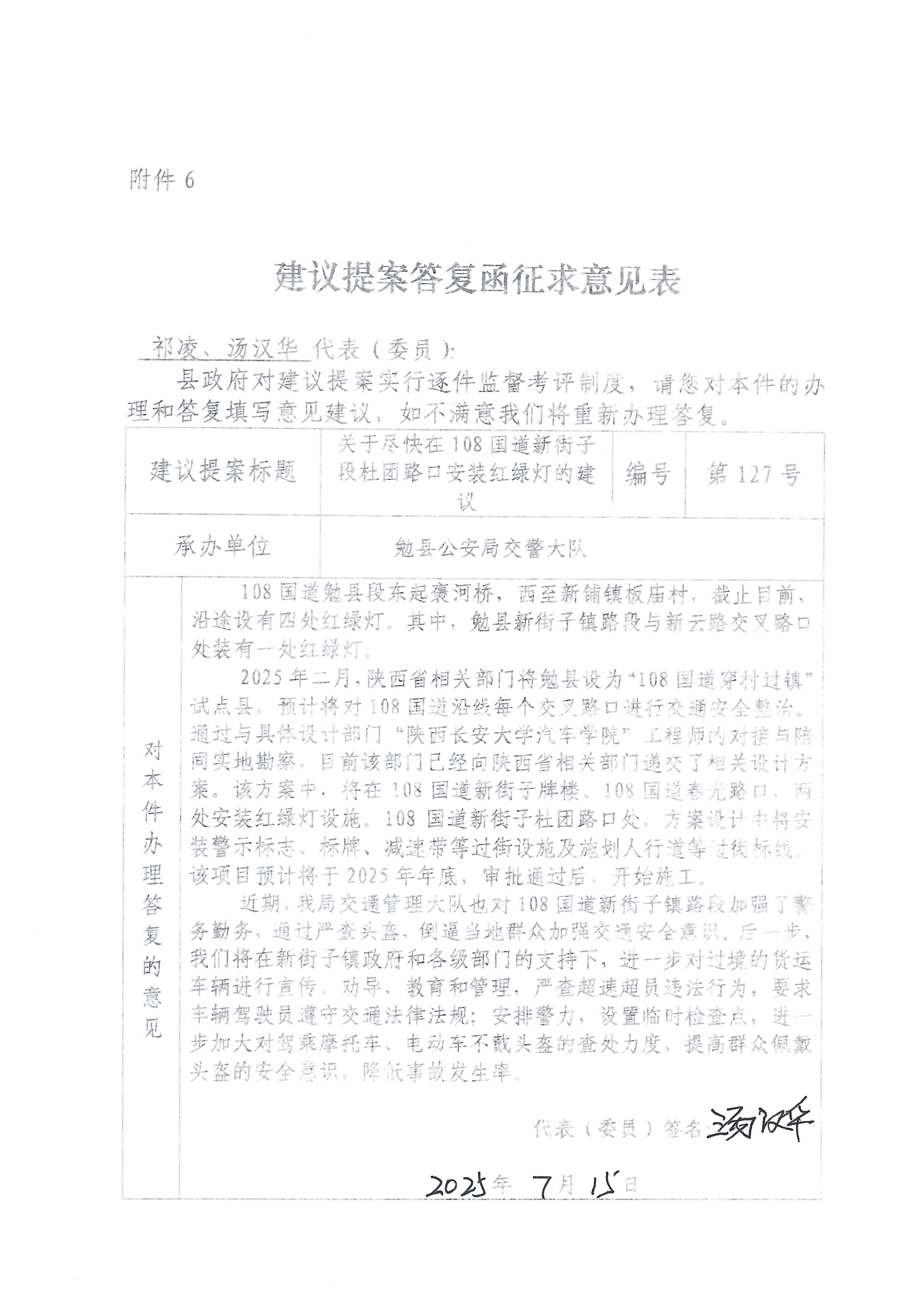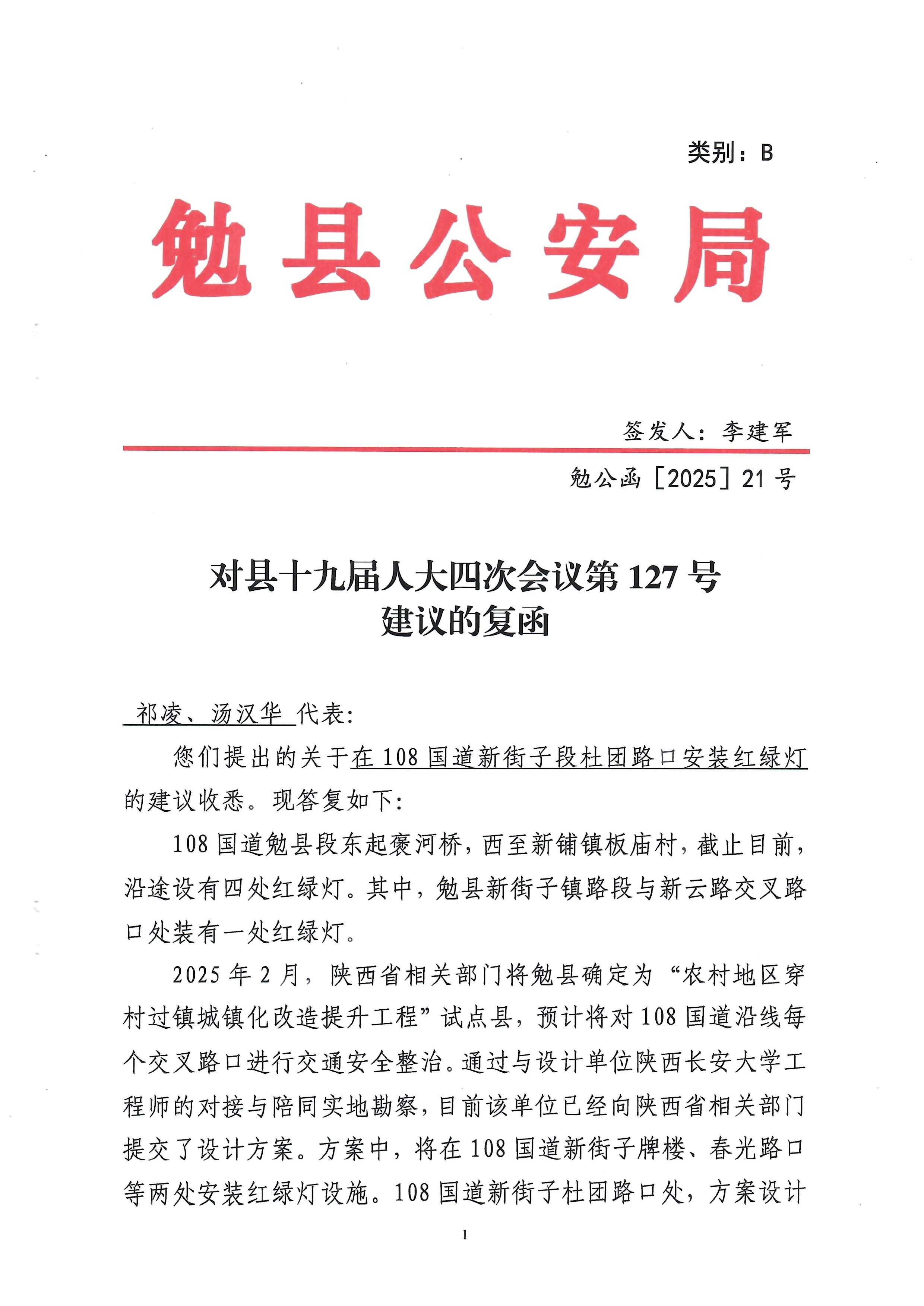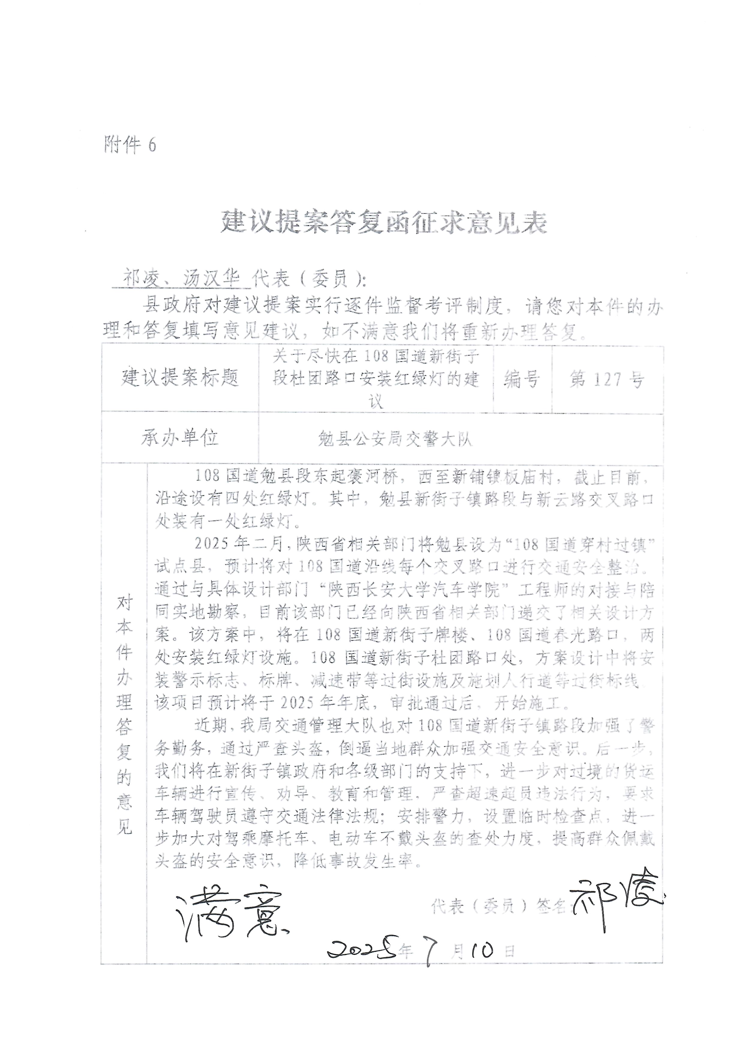 您们提出的关于在108国道新街子段杜团路口安装红绿灯的建议收悉。现答复如下: