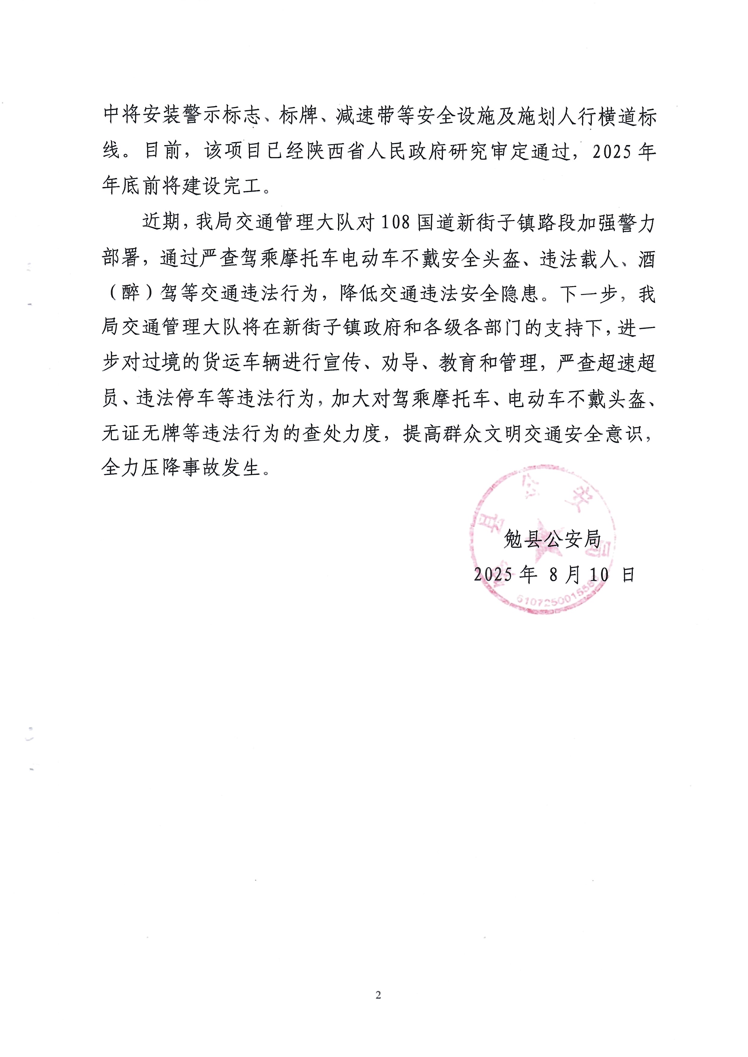 2025年2月,陕西省相关部门将勉县确定为“农村地区穿村过镇城镇化改造提升工程”试点县,预计将对108国道沿线每个交叉路口进行交通安全整治。通过与设计单位陕西长安大学工程师的对接与陪同实地勘察,目前该单位已经向陕西省相关部门提交了设计方案。方案中,将在108国道新街子牌楼、春光路口等两处安装红绿灯设施。108国道新街子杜团路口处,方案设计中将安装警示标志、标牌、减速带等安全设施及施划人行横道标线。目前,该项目已经陕西省人民政府研究审定通过,2025年年底前将建设完工。