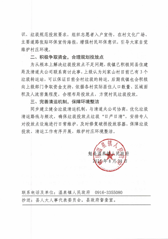 您提出的《关于增设勉县温泉镇刘家山村垃圾集中转运点的建议》收悉,现结合我镇工作实际,回复如下:
