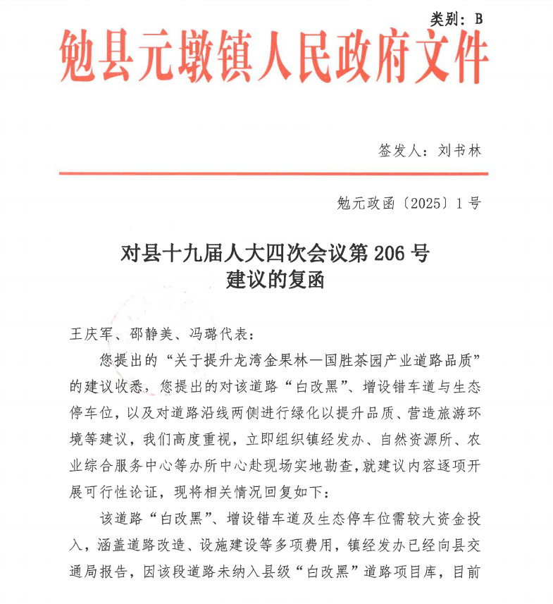 您提出的“关于提升龙湾金果林一国胜茶园产业道路品质”的建议收悉,您提出的对该道路“白改黑”、增设错车道与生态停车位,以及对道路沿线两侧进行绿化以提升品质、营造旅游环境等建议,我们高度重视,立即组织镇经发办、自然资源所、农业综合服务中心等办所中心赴现场实地勘查,就建议内容逐项开展可行性论证,现将相关情况回复如下: