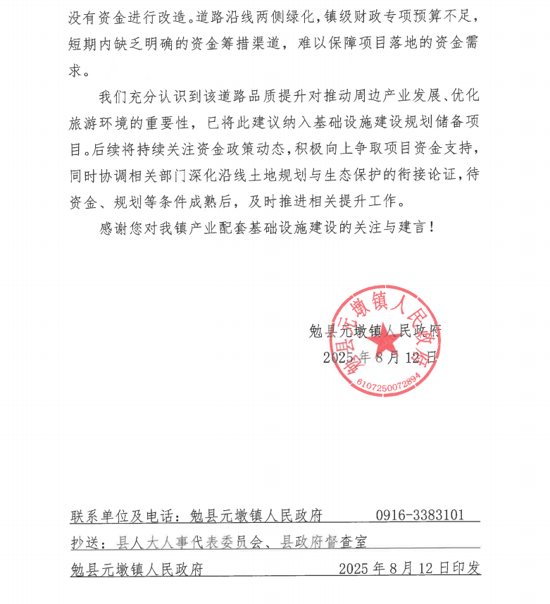 我们充分认识到该道路品质提升对推动周边产业发展、优化旅游环境的重要性,已将此建议纳入基础设施建设规划储备项目。后续将持续关注资金政策动态,积极向上争取项目资金支持,同时协调相关部门深化沿线土地规划与生态保护的衔接论证,待资金、规划等条件成熟后,及时推进相关提升工作。