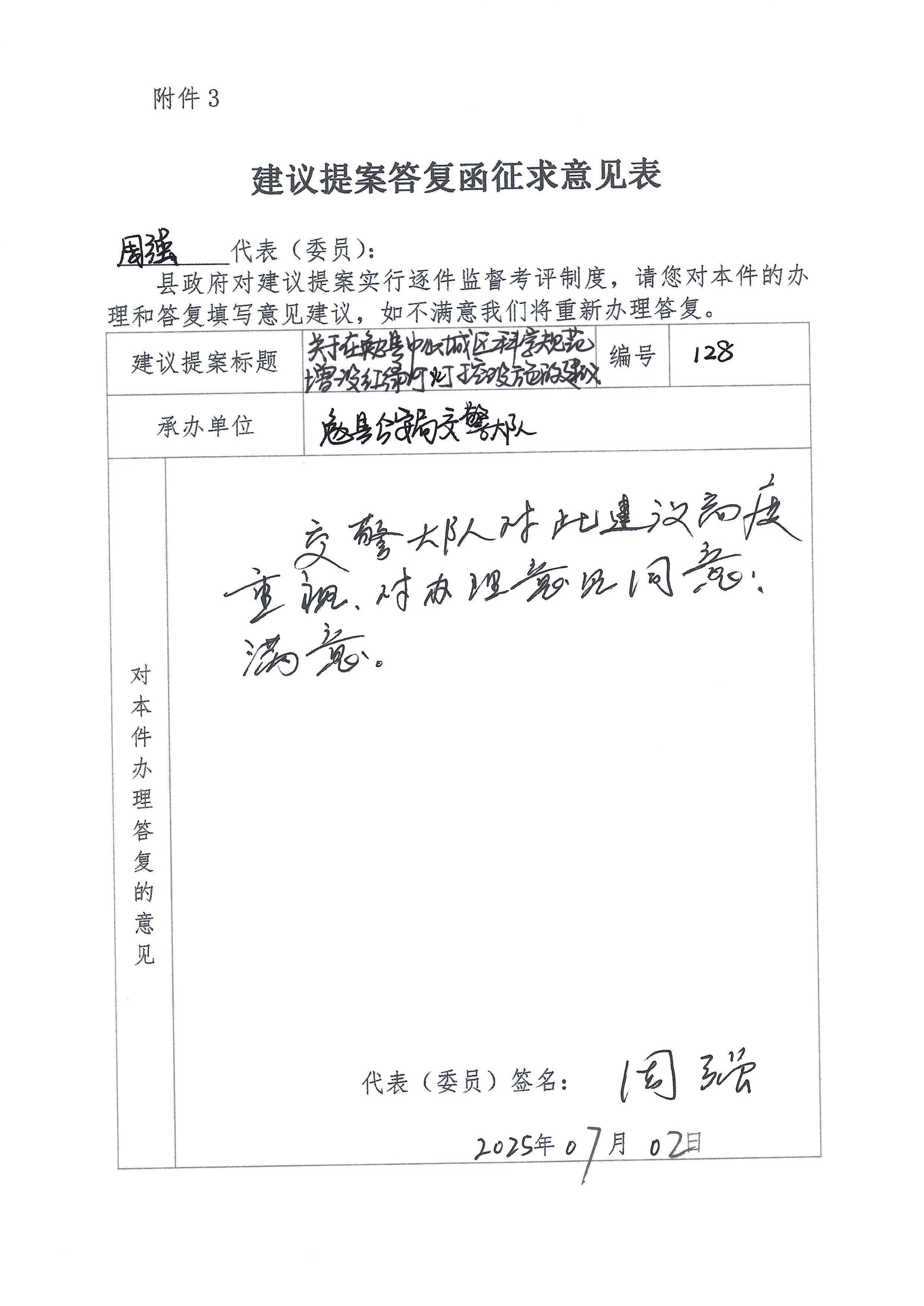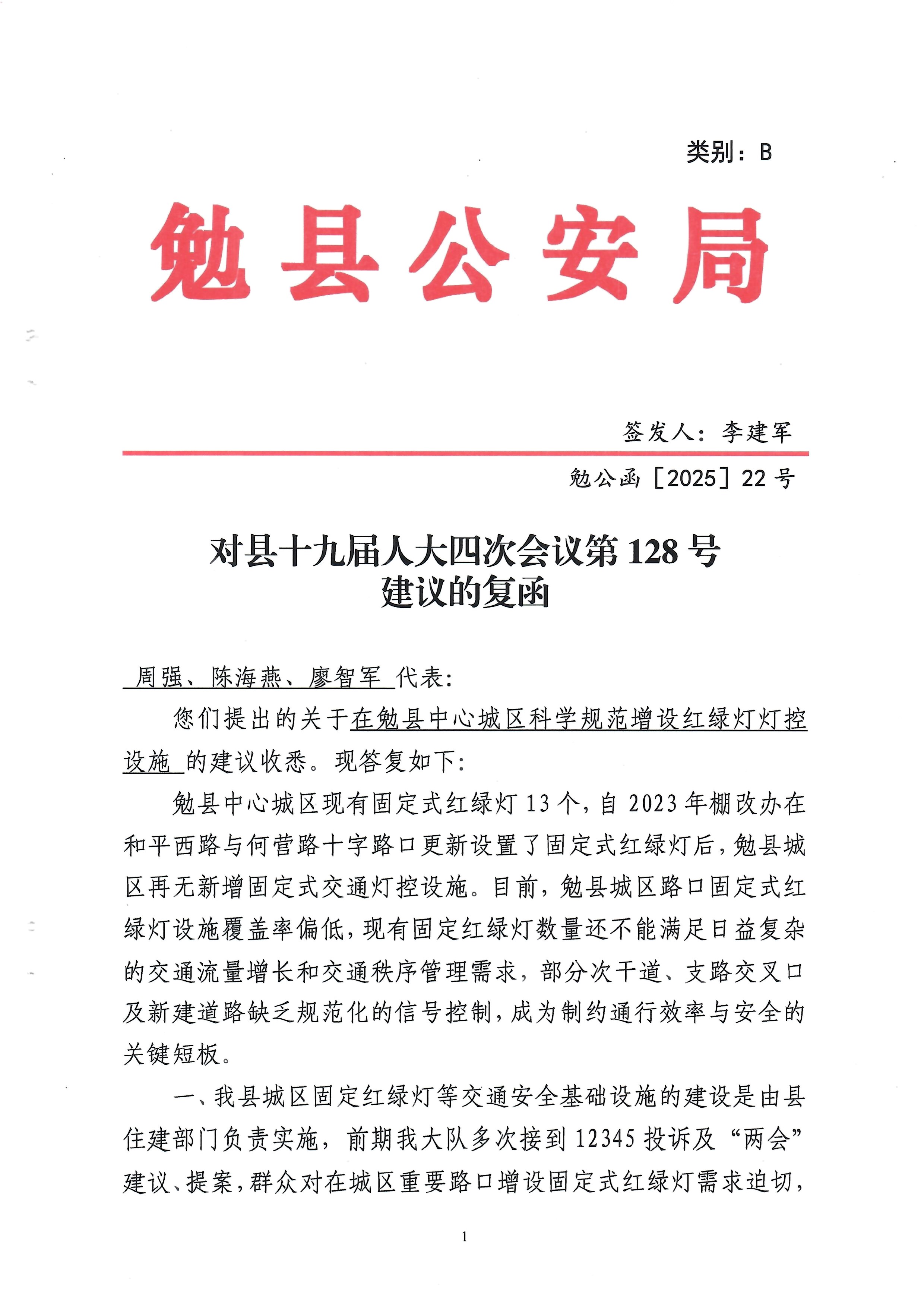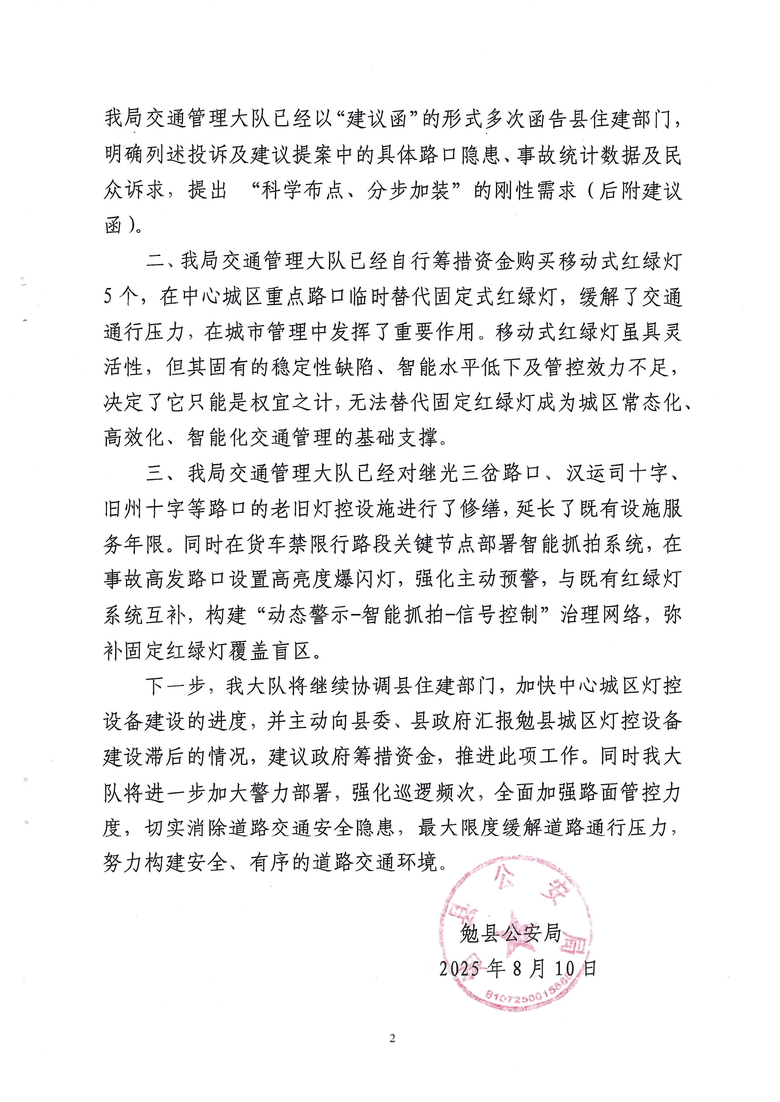 一、我县城区固定红绿灯等交通安全基础设施的建设是由县住建部门负责实施,前期我大队多次接到12345投诉及“两会”建议、提案,群众对在城区重要路口增设固定式红绿灯需求迫切,我局交通管理大队已经以“建议函”的形式多次函告县住建部门,明确列述投诉及建议提案中的具体路口隐患、事故统计数据及民众诉求,提出 “科学布点、分步加装”的刚性需求(后附建议函)。