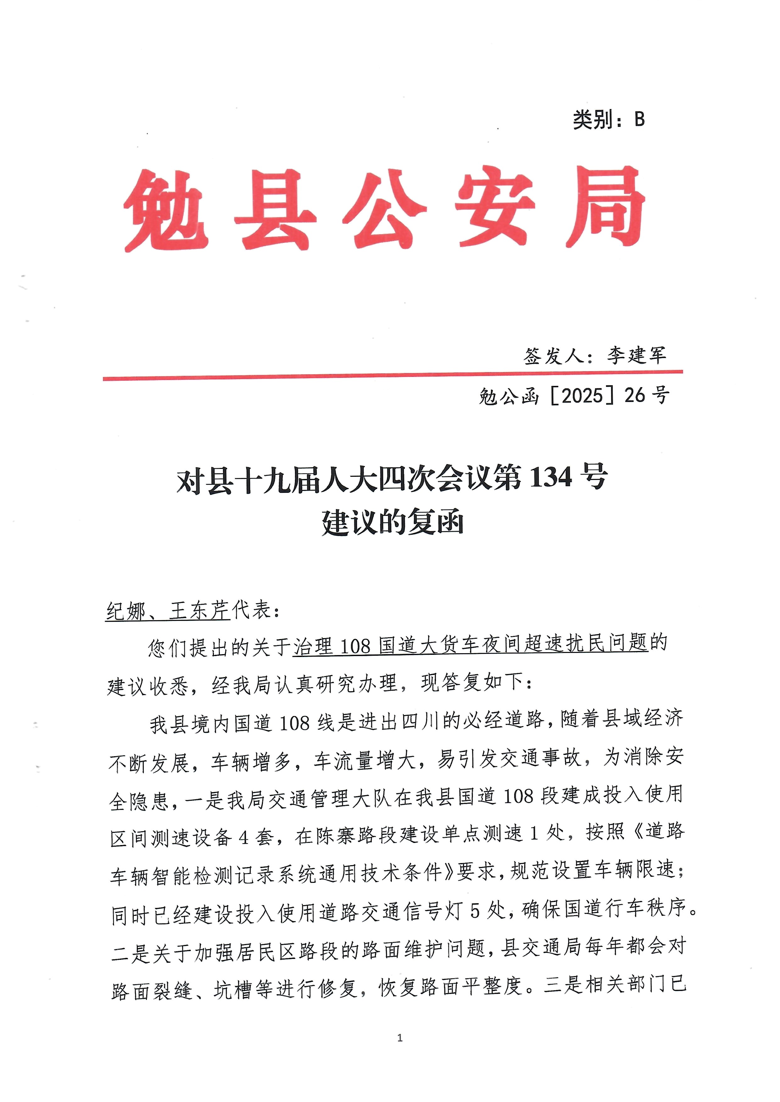 您们提出的关于治理108国道大货车夜间超速扰民问题的建议收悉,经我局认真研究办理,现答复如下: