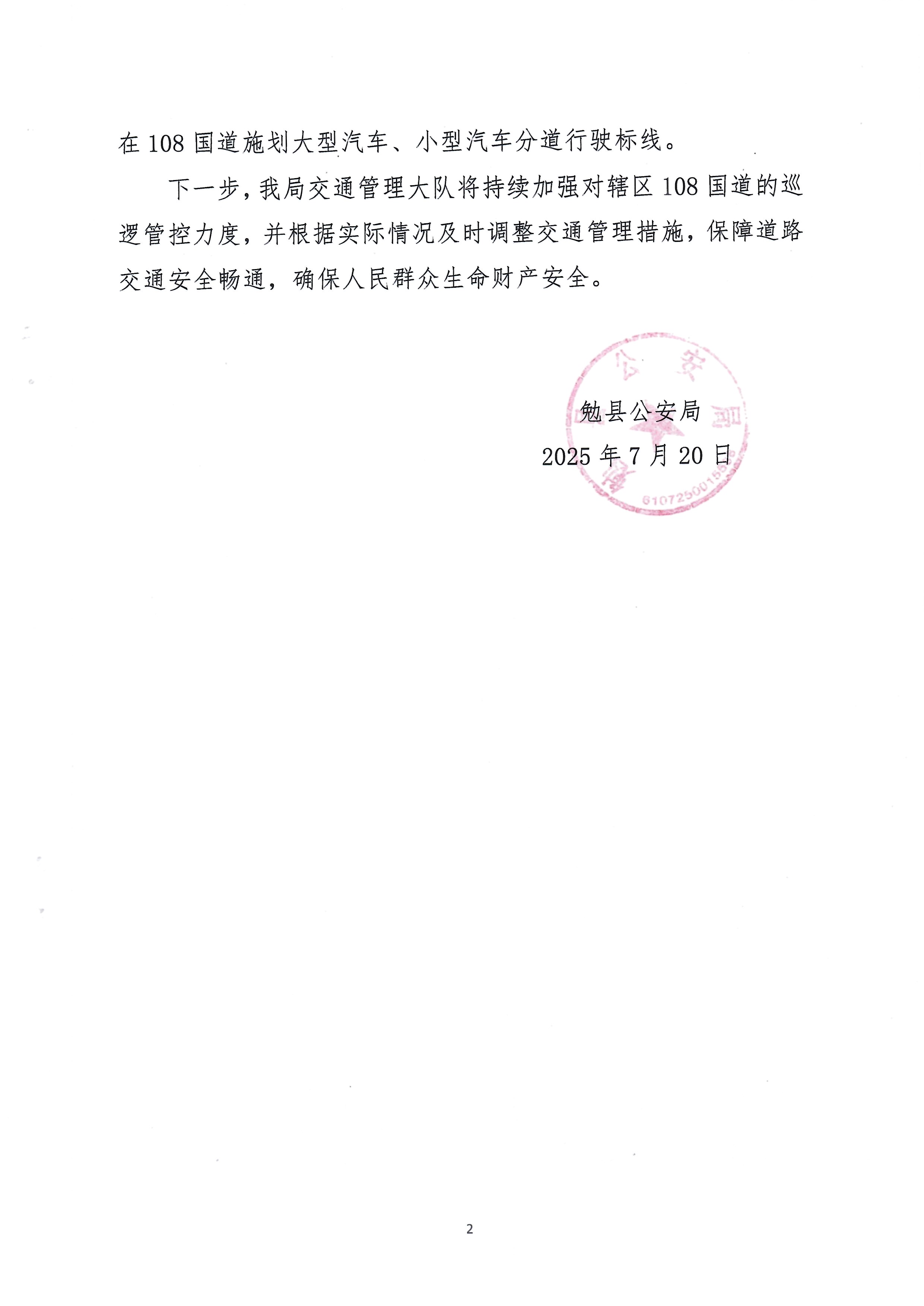 下一步,我局交通管理大队将持续加强对辖区108国道的巡逻管控力度,并根据实际情况及时调整交通管理措施,保障道路交通安全畅通,确保人民群众生命财产安全。