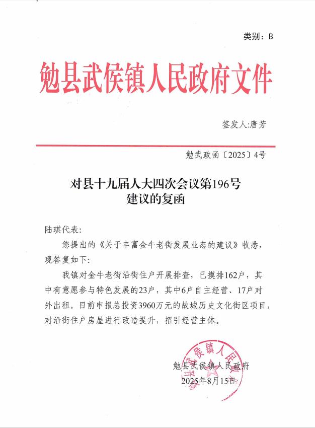 我镇对金牛老街沿街住户开展排查,已摸排162户,其中有意愿参与特色发展的23户,其中6户自主经营、17户对外出租。目前申报总投资3960万元的故城历史文化街区项目,对沿街住户房屋进行改造提升,招引经营主体。