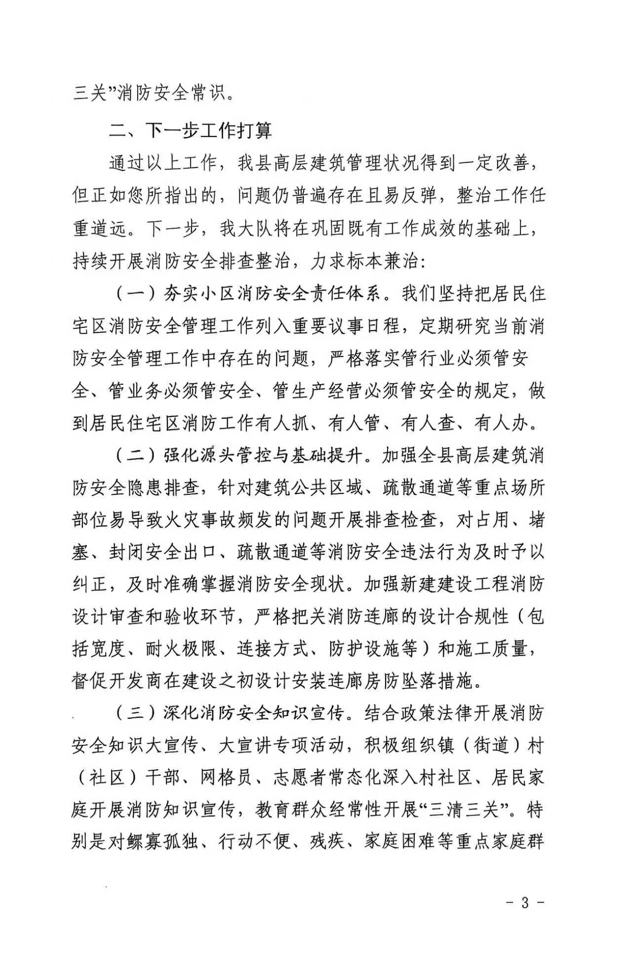 通过以上工作,我县高层建筑管理状况得到一定改善,但正如您所指出的,问题仍普遍存在且易反弹,整治工作任重道远。下一步,我大队将在巩固既有工作成效的基础上,持续开展消防安全排查整治,力求标本兼治: