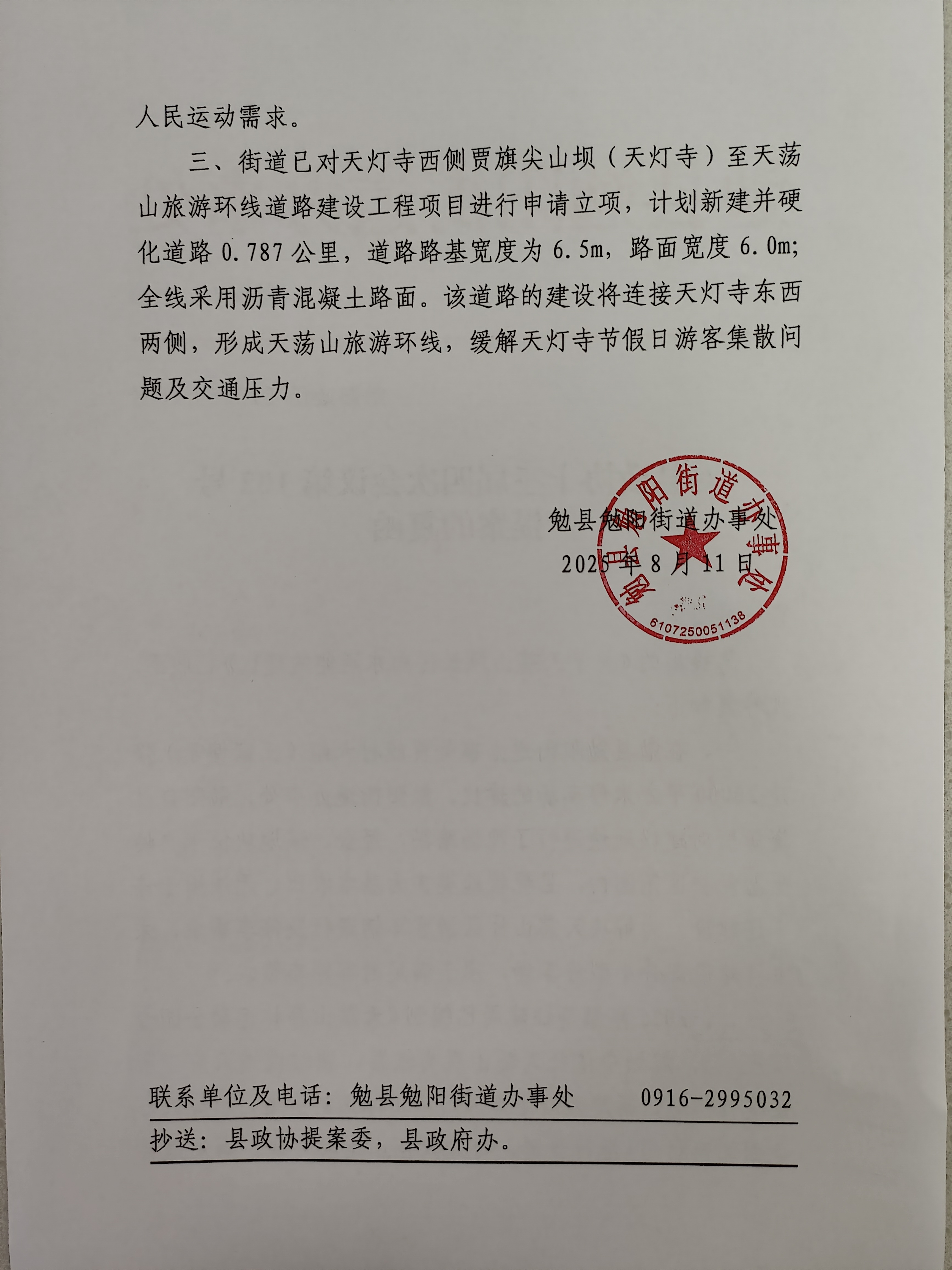 三、街道已对天灯寺西侧贾旗尖山坝(天灯寺)至天荡山旅游环线道路建设工程项目进行申请立项,计划新建并硬化道路 0.787公里,道路路基宽度为6.5m,路面宽度 6.0m;全线采用沥青混凝土路面。该道路的建设将连接天灯寺东西两侧,形成天荡山旅游环线,缓解天灯寺节假日游客集散问题及交通压力。
