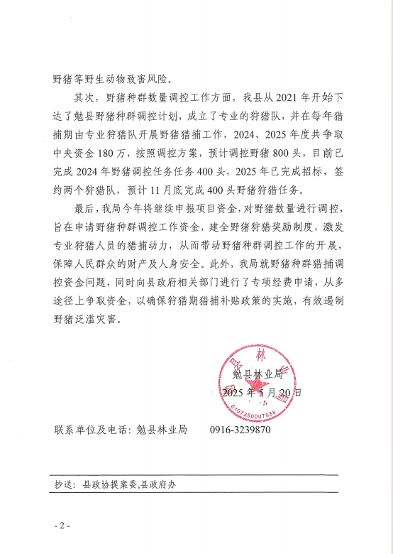 其次,野猪种群数量调控工作方面,我县从2021年开始下达了勉县野猪种群调控计划,成立了专业的狩猎队,并在每年猎捕期由专业狩猎队开展野猪猎捕工作,2024、2025年度共争取中央资金180万,按照调控方案,预计调控野猪800头,目前已完成2024年野猪调控任务任务400头,2025年已完成招标,签约两个狩猎队,预计11月底完成400头野猪狩猎任务。