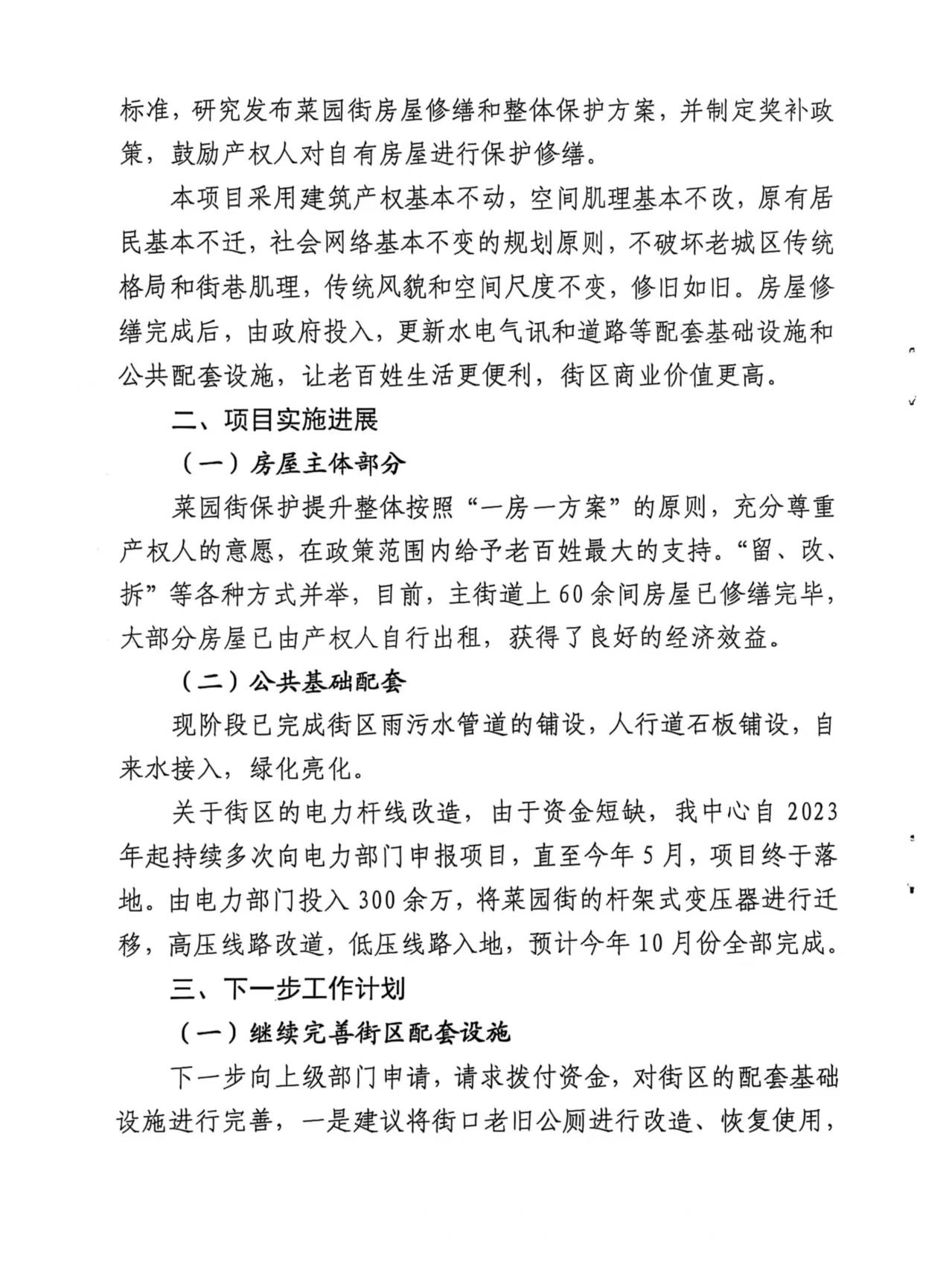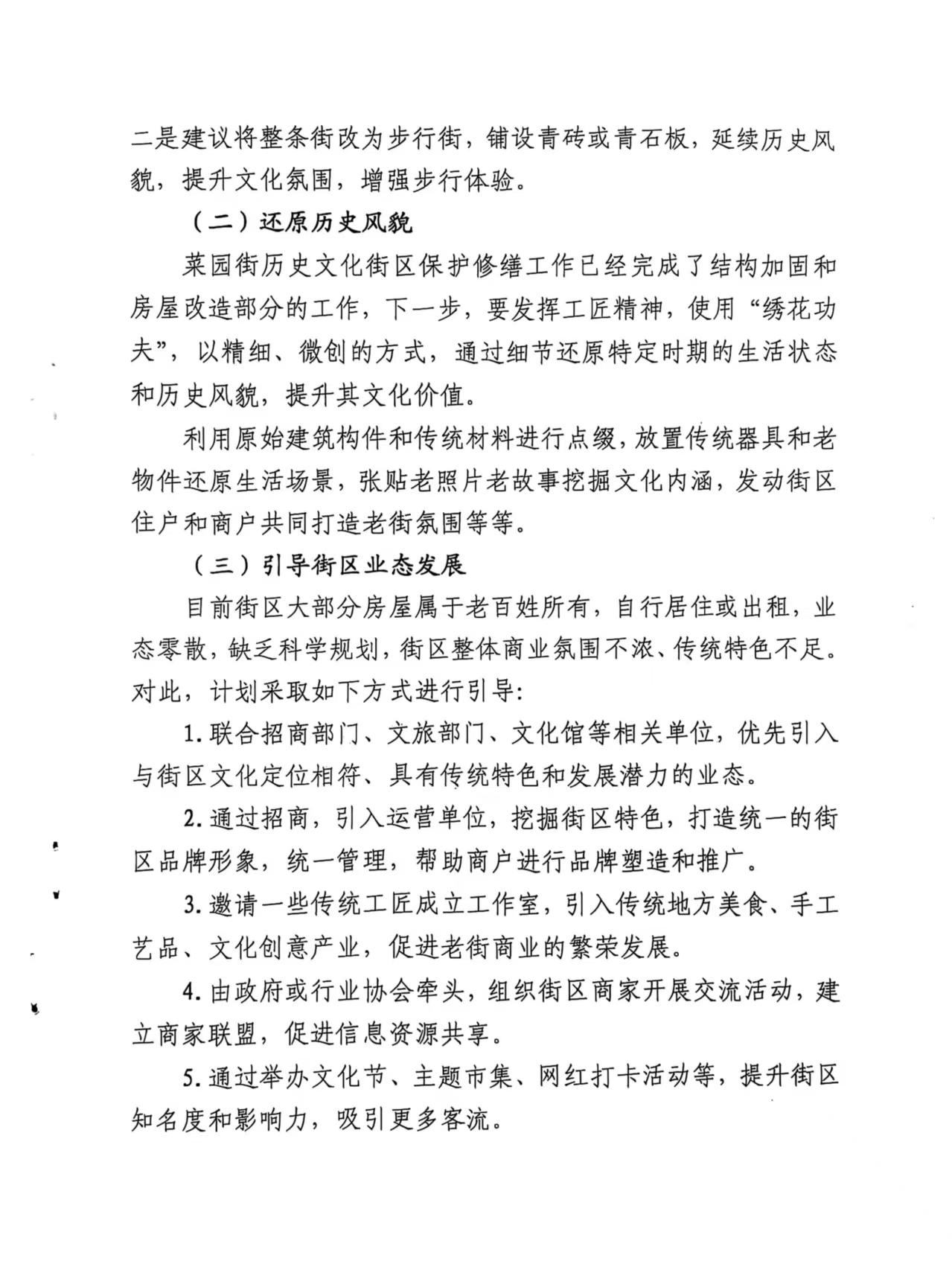 建议:本项目采用建筑产权基本不动,空间肌理基本不改,原有居民基本不迁,社会网络基本不变的规划原则,不破坏老城区传统格局和街巷肌理,传统风貌和空间尺度不变,修旧如旧。房屋修缮完成后,由政府投入,更新水电气讯和道路等配套基础设施和公共配套设施,让老百姓生活更便利,街区商业价值更高。