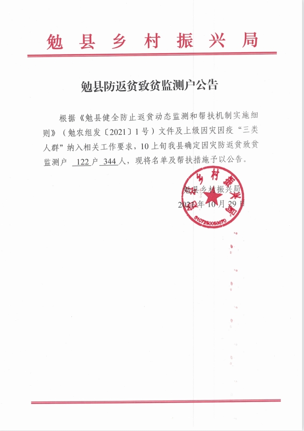 勉县防返贫致贫监测户公告