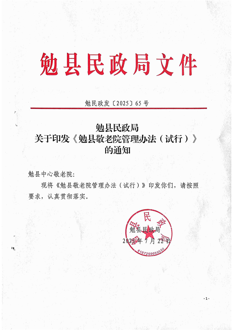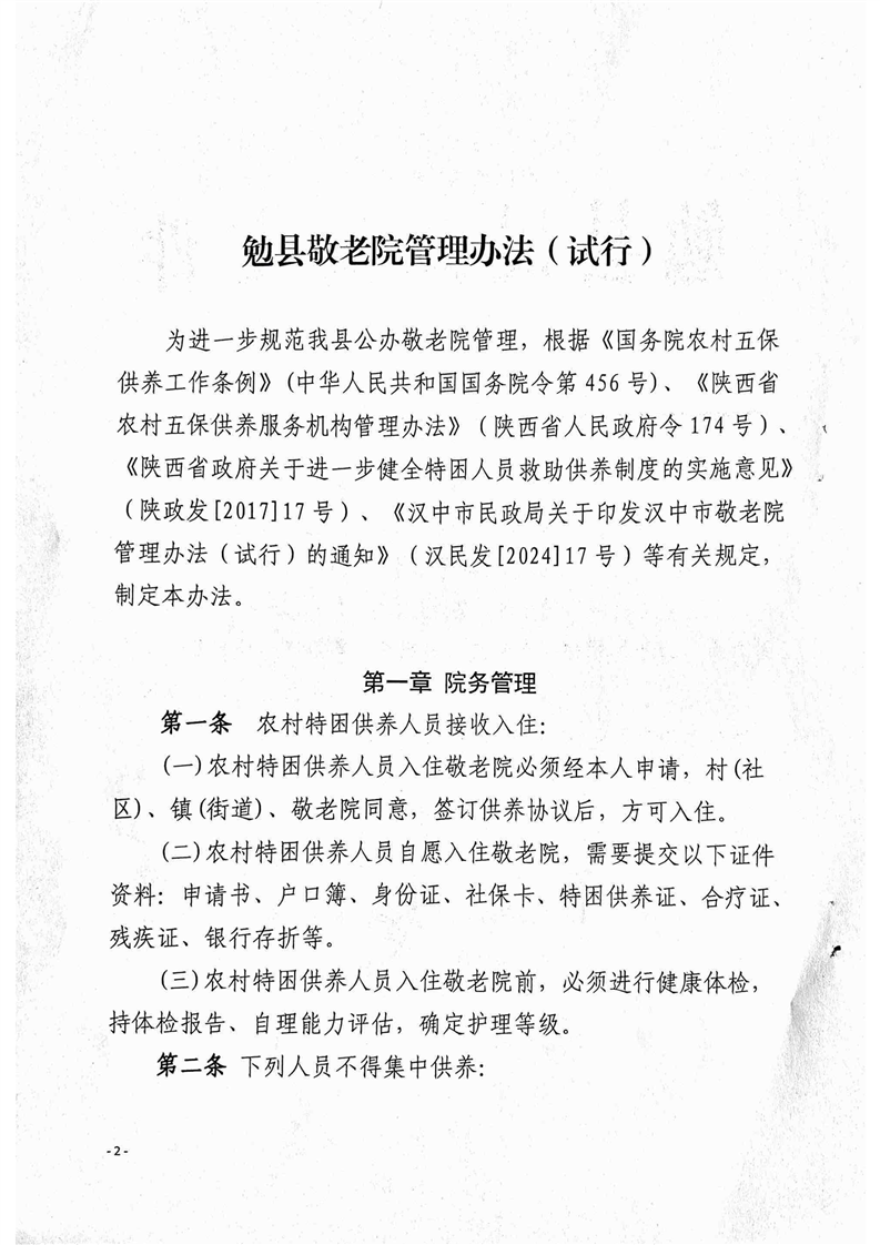 关于印发《勉县敬老院管理办法(试行)》的通知