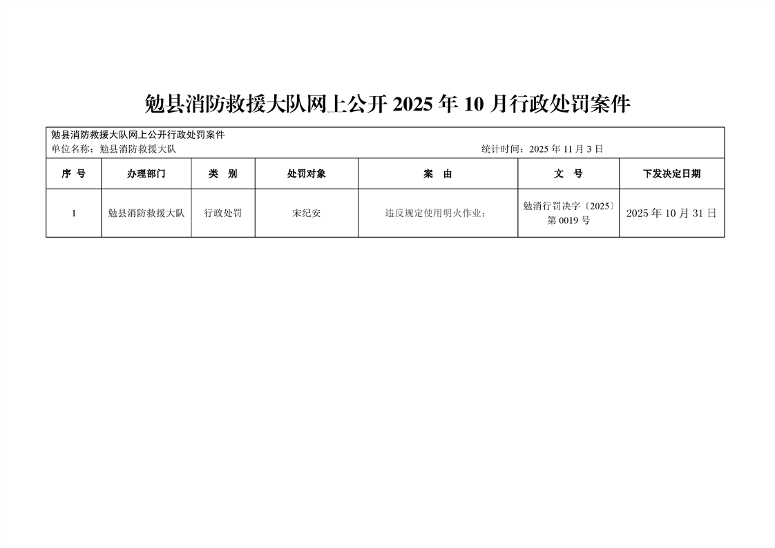 勉县消防救援大队网上公开2025年10月行政处罚案件
