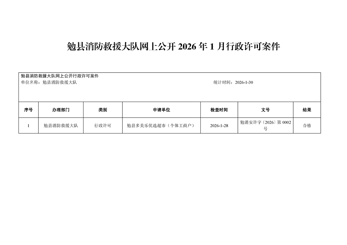 勉县消防救援大队网上公开2026年1月行政许可案件