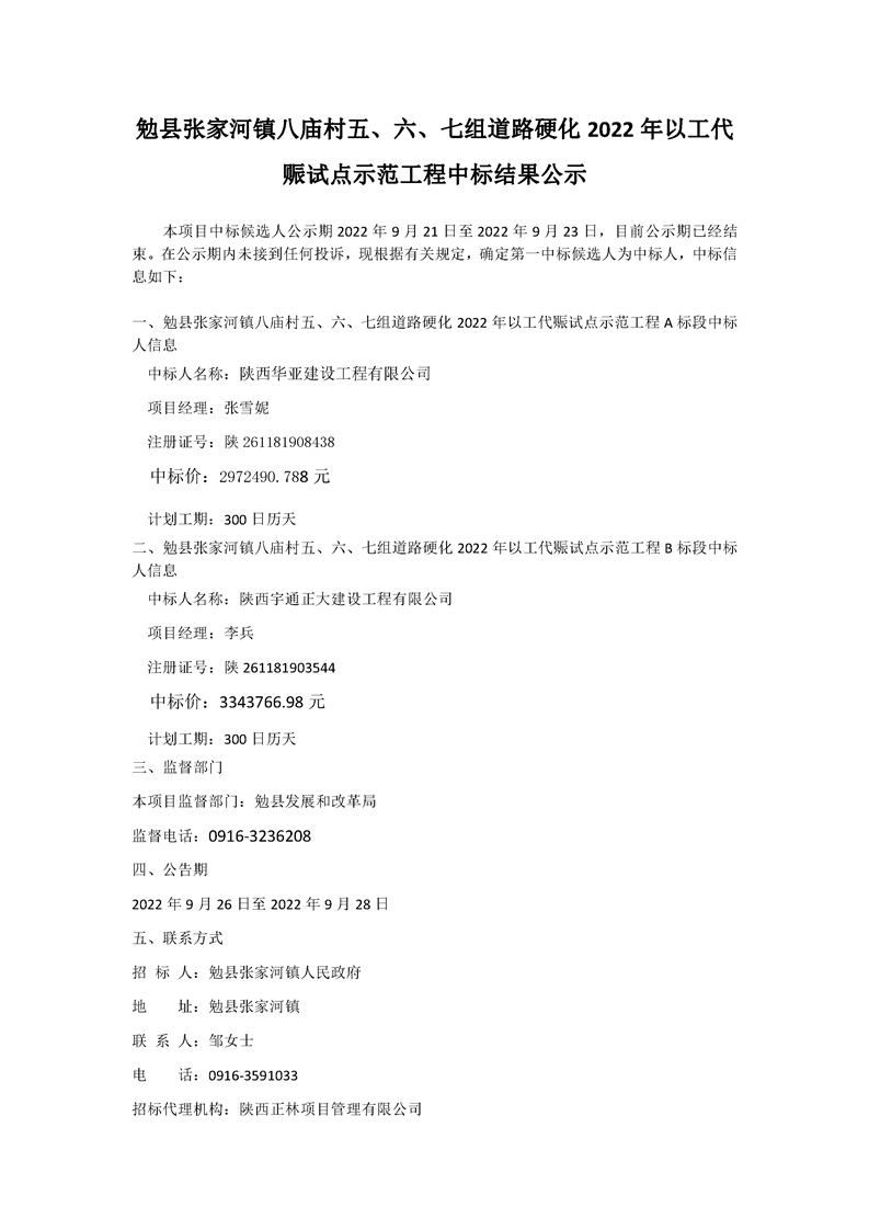 勉县张家河镇八庙村五、六、七组道路硬化2022年以工代赈试点示范工程中标结果公示
