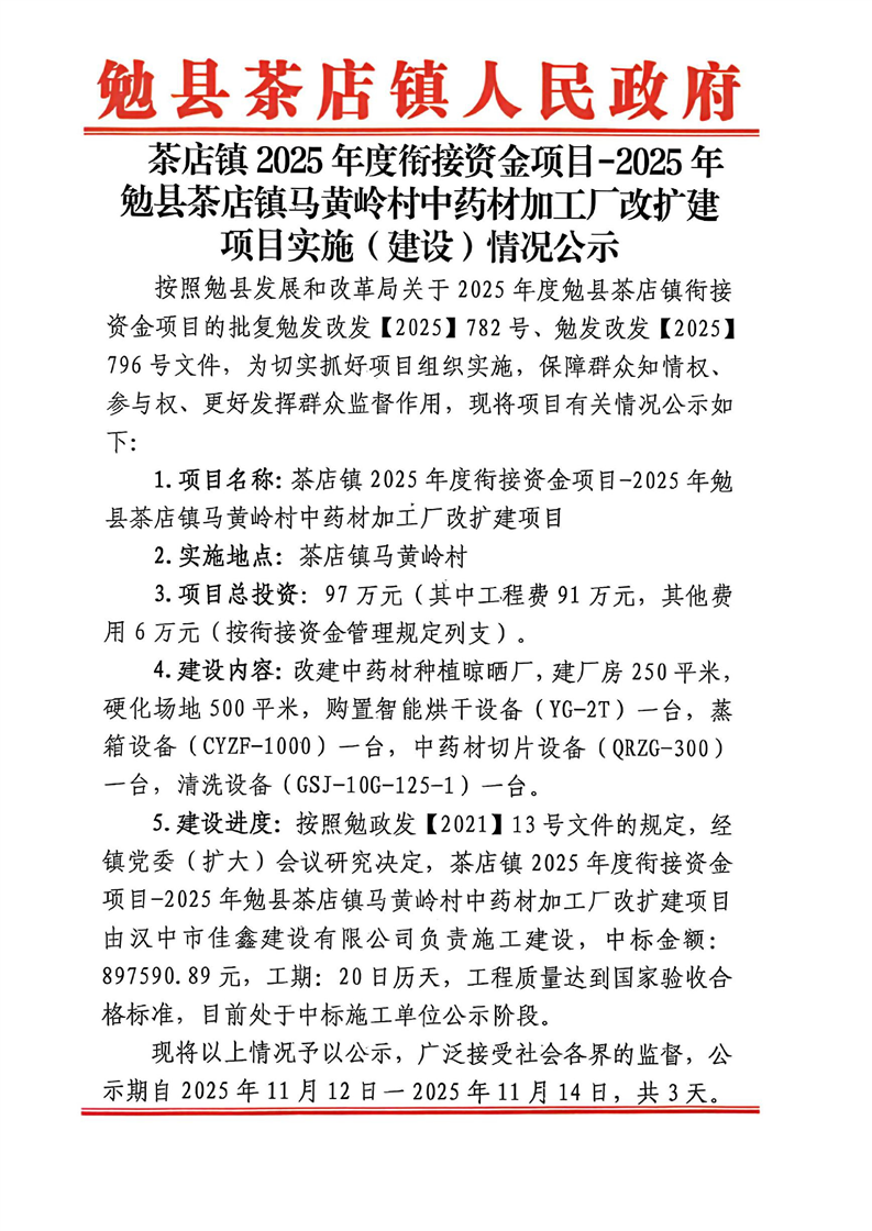 茶店镇2025年度衔接资金项目-2025年勉县茶店镇马黄岭村中药材加工厂改扩建项目实施(建设)情况公示