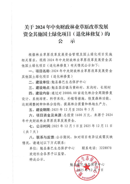 关于2024年中央财政林业草原改革发展资金其他国土绿化项目(退化林修复)的公示
